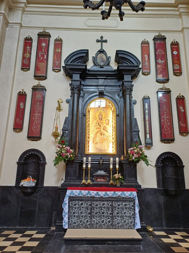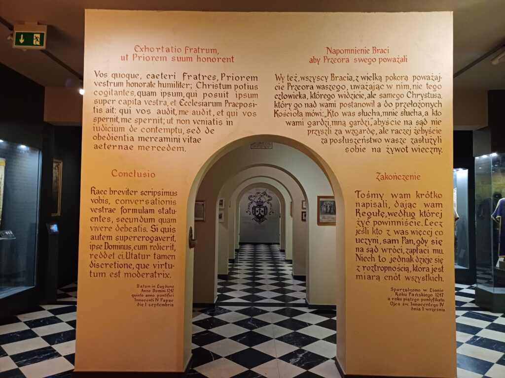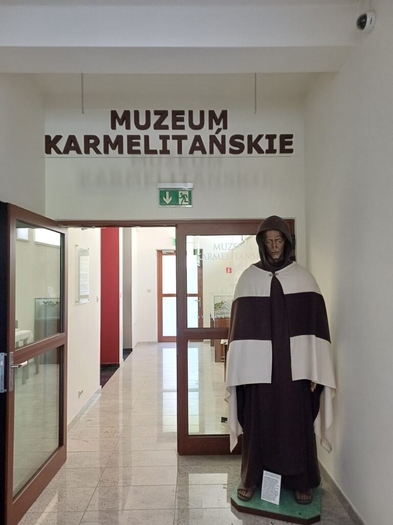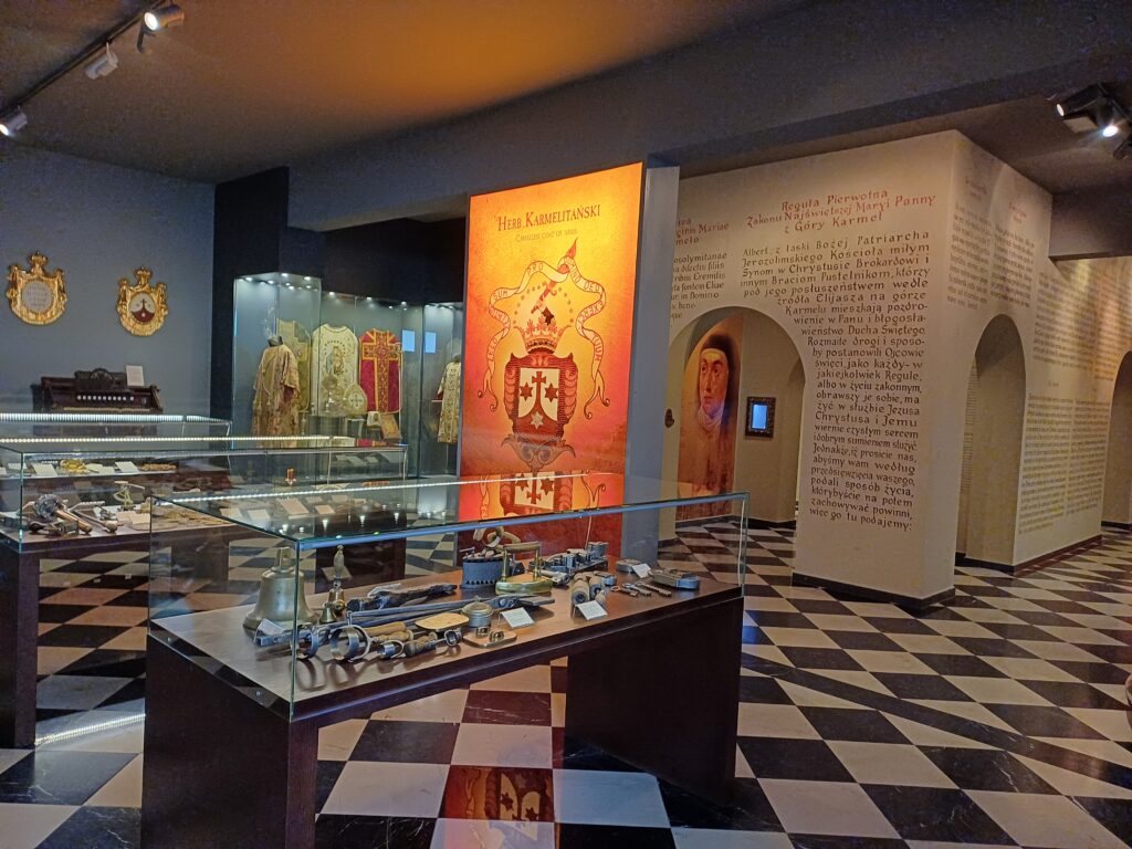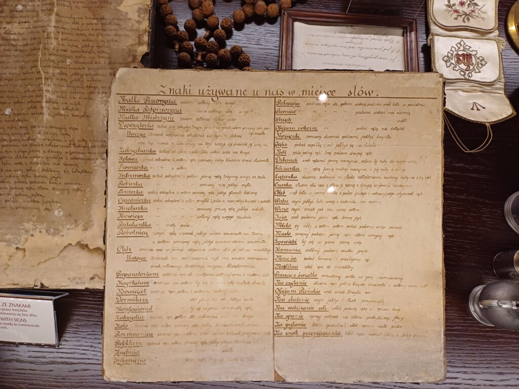 Obok zabytkowego kompleksu klasztornego stoją nowoczesne budynki Domu Pielgrzyma, w których znajdują się dwa muzea: Muzeum Misyjne, które przeniesie nas na kilka chwil do Afryki oraz Muzeum Karmelitów, gdzie możemy poznać bliżej aspekty karmelitańskiego życia. Jego zwiedzanie nie zajmie dużo czasu, a można w nim wychwycić ciekawe kąski. Zanim jednak opowiem Wam, co najbardziej spodobało mi się w tym muzeum, kilka słów wprowadzenia na temat zakonu. Karmelici czyli Zakon Braci Najświętszej Maryi Panny z Góry Karmel, to zgromadzenie kontemplacyjne o surowej regule. To wspólnota osób, które chociaż mieszkają pod jednym dachem, prowadzą pustelniczy tryb życia oparty na medytacji, przebywają wśród ludzi, ale pielęgnują samotność i kładą duży nacisk na post. W początkach istnienie czernieńskiego klasztoru obowiązywała bardzo surowa reguła, która nakazywała braciom modlitwę, pracę fizyczną i milczenie. W muzeum znajdziemy rzecz, która najbardziej przypadła mi do gustu, tj. instrukcję znaków używanych zamiast słów (wprawdzie pochodzącą z żeńskiego klasztoru, ale bracia na pewno mieli podobny system komunikacji). Jak bez słów poprosić o światło? Wystarczy dmuchnąć w podniesiony do góry palec. A masło? Trzeba posmarować palcem rozłożoną dłoń.