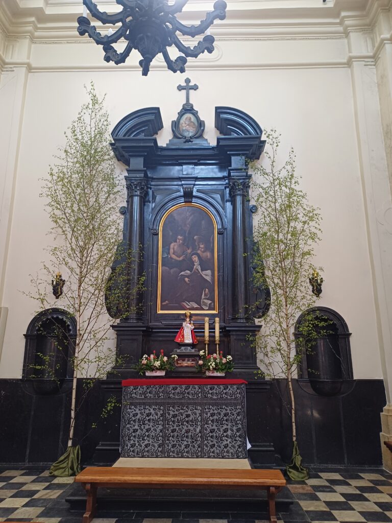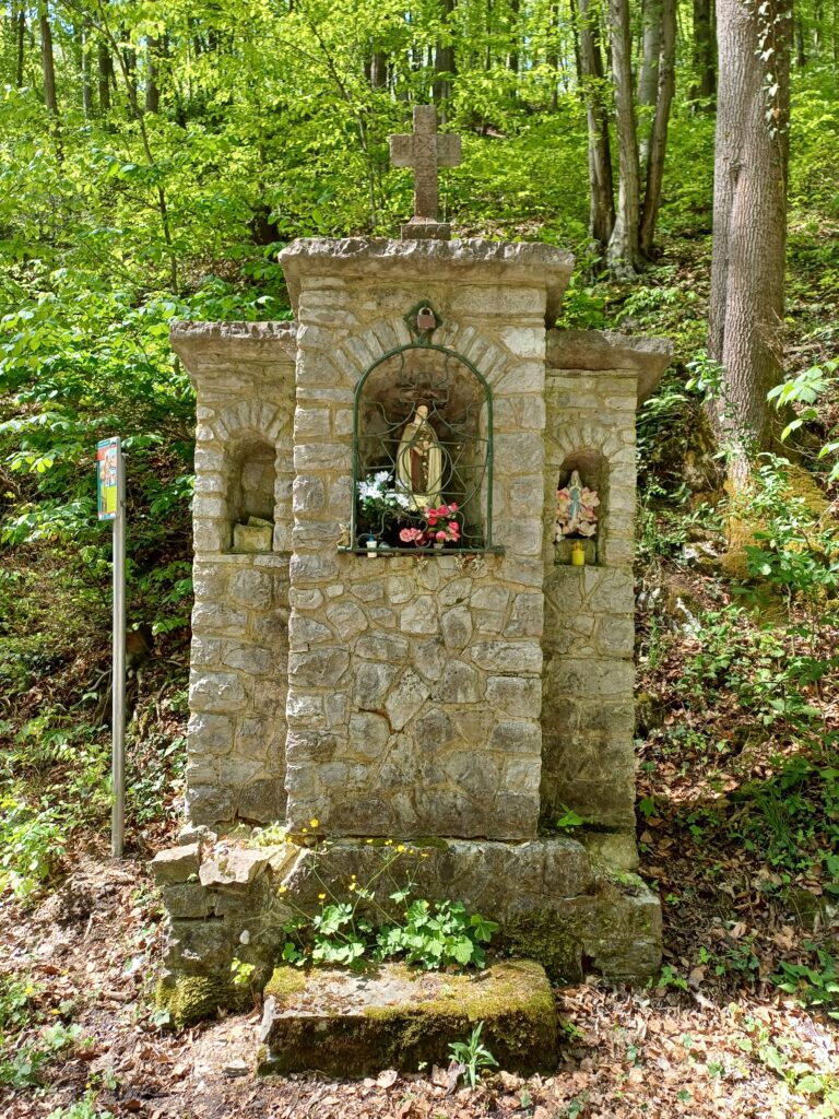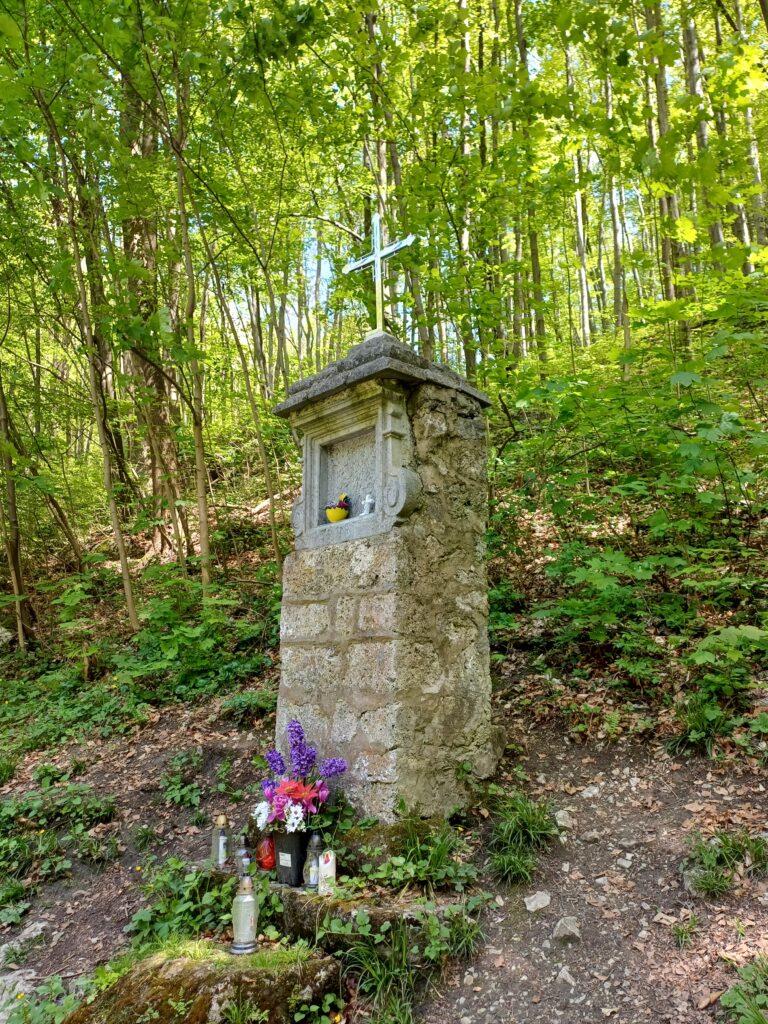 Pora opuścić klasztorne mury i udać się na spacer po rezerwacie. Żeby nie zgubić się w lesie korzystam z oznaczonej na czerwono ścieżki historyczno-przyrodniczej zwanej Dróżkami Karmelitańskimi. Nazwa nie jest przypadkowa, ponieważ tereny obecnego rezerwatu stanowiły dawniej własność klasztoru i otoczone były murem, w związku z czym na liczącej niewiele ponad 3 km trasie można spotkać pozostałości klasztornych zabudowań. Ścieżka zaczyna się na przyklasztornym dolnym parkingu. Wchodzę do lasu i od razu ścieżka prowadzi mocno w dół. Niestety jest to dość krótki odcinek lasem i zaraz dochodzę do asfaltowej drogi, którą trzeba pokonać około pięćset metrów pilnując czerwonych znaków. Po drodze mijam kapliczkę św. Teresy od Dzieciątka Jezus z 1925 r.
