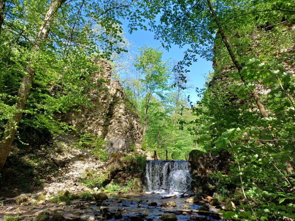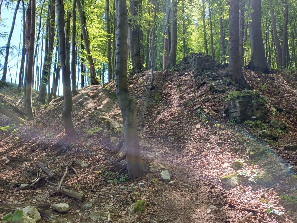 Szybko ruszyłam w dalszą drogę i akurat zrobił się pod górkę. Po wykonaniu intensywnych ćwiczeń kondycyjno-wydolnościowych, minęła czternasta, syrena nie wyła i było znowu z ostro górki, a w lesie zaczęły pojawiać się kolejne ślady dawnego klasztoru: