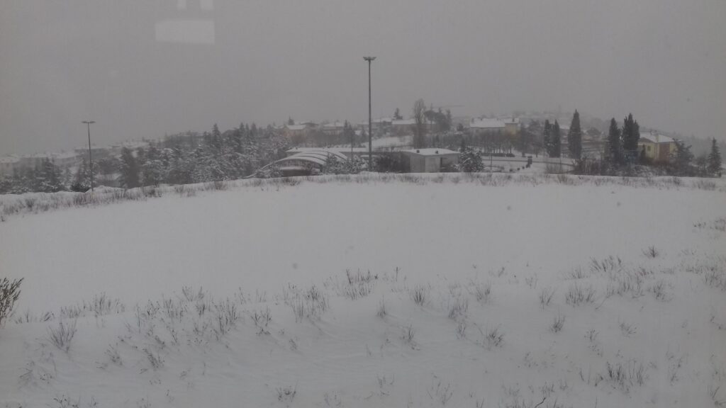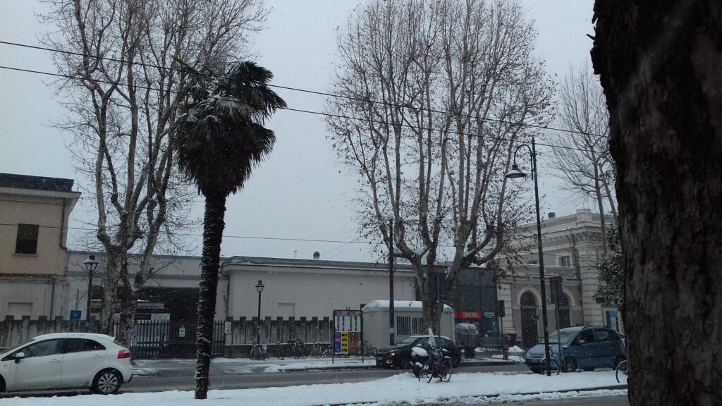 Na pierwsze problemy wywołane śniegiem natknęliśmy się zaraz po przylocie do Bolonii. Już stąpając ostrożnie po stopniach samolotu nie mogłam uwierzyć w to, co widzę. Włosi raczej też nie. A dalej było tylko gorzej. Ulice i chodniki Bolonii pokrywała około 10 centymetrowa warstwa śniegu. Dla mieszkańców Polski południowej nie jest to jakaś straszna ilość, ale tutaj była to zapowiedź katastrofy. Mimo to pierwszy etap podróży, tj. z lotniska na dworzec kolejowy, przebiegł bez problemu. Jednak był to ostatni bezproblemowy jej fragment. Na dworcu okazało się, że większość pociągów, w tym do Rimini (skąd mieliśmy złapać autobus do San Marino, gdzie czekał na nas pierwszy nocleg i ciepłe łóżko) jest odwołana z powodu śniegu leżącego na torach. Zaskoczeni i zdezorientowani, ściskając w ręku bilety kolejowe kupione w automacie, zanim zorientowaliśmy się, co się dzieje i nie mając pomysłu, co dalej, udaliśmy się na kawę (kawa wiadomo jest dobra na wszystko). Kawa rzeczywiście rozjaśniła nam w głowie i pomogła podjąć decyzje. Czekamy góra dwie godziny, a po tym czasie bukujemy nocleg w Bolonii. Po godzinie okazało się, że jednak jest jeden pociąg w interesującym nas kierunku. Zajęliśmy miejsca w zimnych wagonach i ruszyliśmy w drogę. W Rimini pogoda nie była lepsza, spacer po plaży w oczekiwaniu na przesiadkę był zupełnie pozbawiony sensu, ale za to nie było informacji o odwołanych autobusach. Natomiast San Marino zamieniło się w Alaskę.