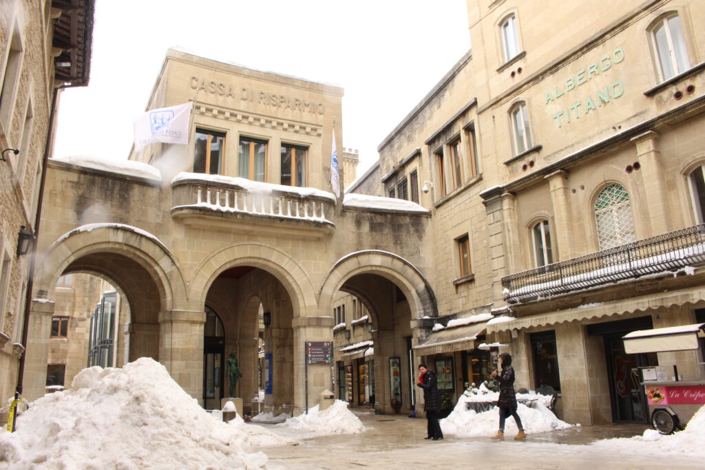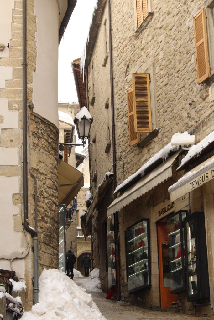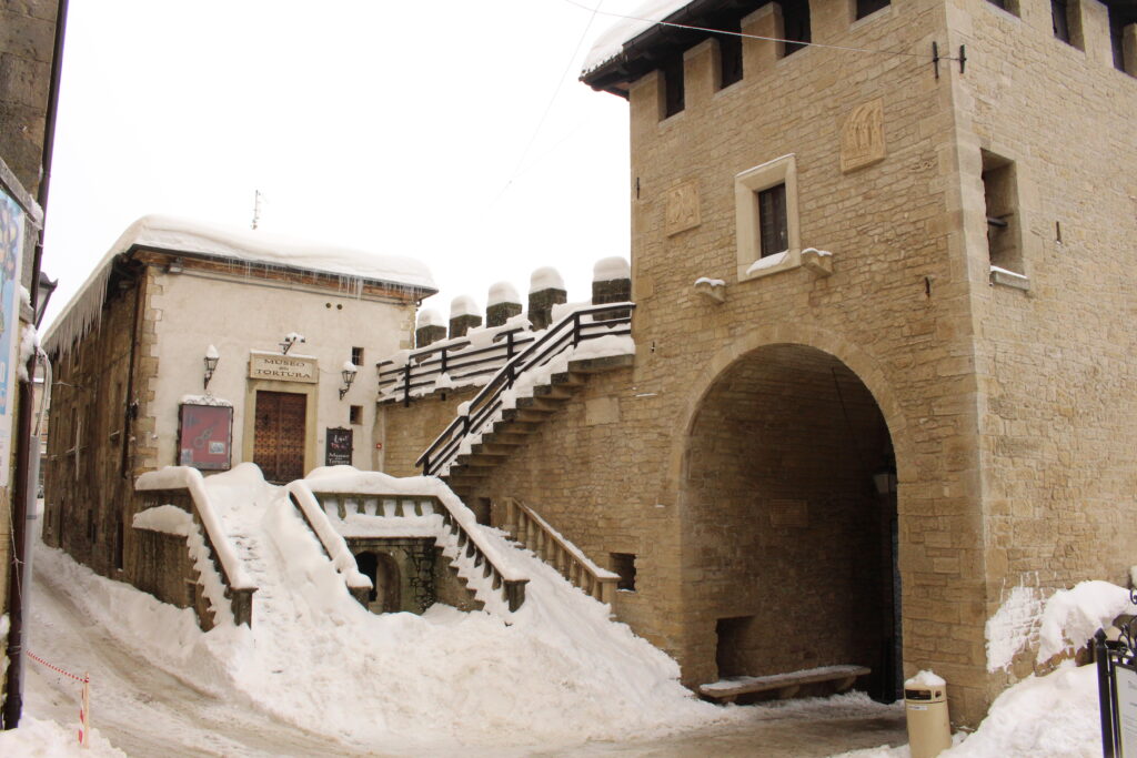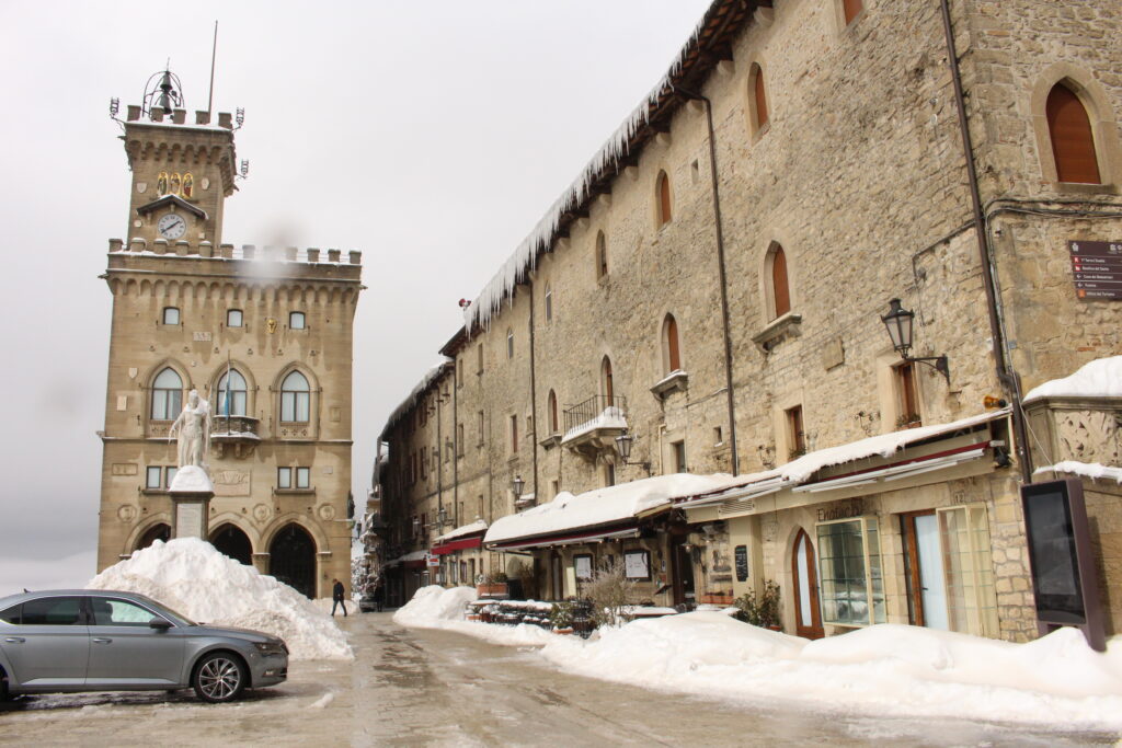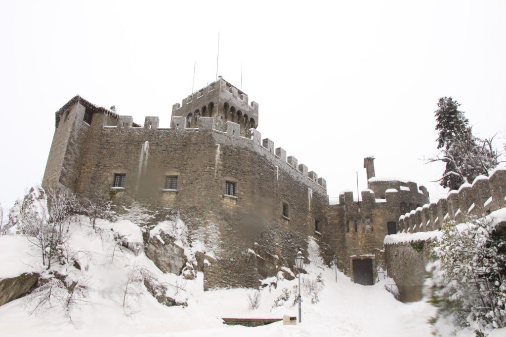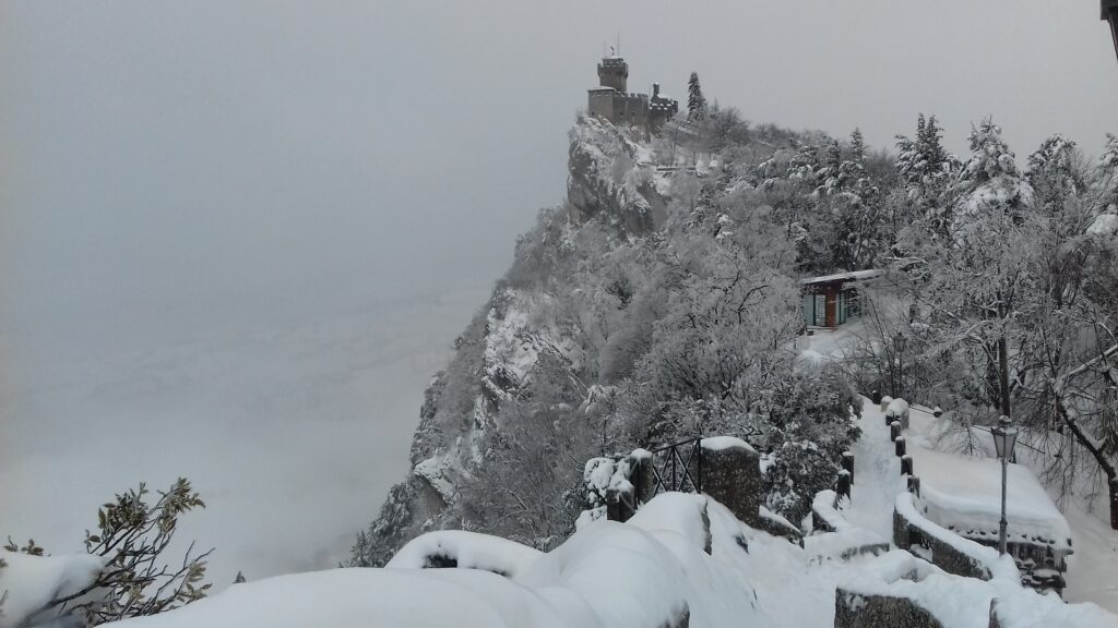 San Marino to jedno z najmniejszych państw świata, a zrazem najstarsza republika (istnieje od IV w. n.e.), stanowiąca enklawę na terenie Włoch. Powierzchnia 61 km kwadratowych stawia je na końcu listy krajów ułożonej pod względem wielkości, ale przed Watykanem i Monako. To położone na wzgórzach państwo zamieszkuje około 33 tys. osób. Językiem urzędowym jest język włoski, a obowiązującą walutą jest euro, mimo że San Marino nie jest członkiem Unii Europejskiej. Chociaż nie jest członkiem Unii można tutaj wjechać posługując się dowodem osobistym, bez dodatkowych dokumentów, pod warunkiem, że pobyt trwa maksymalnie 10 dni. Dłuższy pobyt musi zostać zgłoszony w oddziale ds. cudzoziemców. Klimat podobno jest tutaj śródziemnomorski, lata są ciepłe i suche, a zimy łagodne 😉 No dobra, dużego mrozu nie było, to fakt.